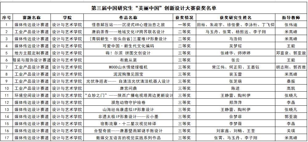 近日,由教育部學(xué)位與研究生教育司指導(dǎo),中國學(xué)位與研究生教育學(xué)會、中國科協(xié)青少年科技中心主辦的第三屆中國研究生“美麗中國”創(chuàng)新設(shè)計大賽全國總決賽在黑龍江大學(xué)舉行。經(jīng)激烈角逐,我校研究生團隊斬獲國家級獎項17項,其中,一等獎1項、二等獎3項、三等獎13項,1名教師獲優(yōu)秀指導(dǎo)教師。獲獎數(shù)量與質(zhì)量均刷新我校參賽紀錄,創(chuàng)下該賽事全國總決賽歷史最佳成績。