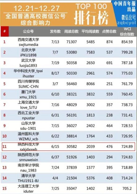 據(jù)統(tǒng)計(jì),本周全國共有455所高校參與排名,其中61所高校的單篇文章平均閱讀量超過1000次。我校官方微信圖文《我們的十年丨咸陽老校區(qū)的時(shí)光相冊》,以高達(dá)19102次的閱讀量居全國第四。同時(shí),在本周“top100全國高校微信公眾號綜合能力排行榜”中,我校以30582次閱讀總數(shù)、724.89分的微信傳播綜合指數(shù)(WCI)位居全國第十一位。