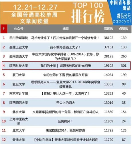12月29日,中國青年報(bào)統(tǒng)計(jì)并發(fā)布“12.21-12.27 top100全國高校微信單篇文章單周閱讀量排行榜”,我校官方微信圖文《我們的十年丨咸陽老校區(qū)的時(shí)光相冊》,以高達(dá)19102次的閱讀量位列全國第四,點(diǎn)贊數(shù)301次排行全國第一。