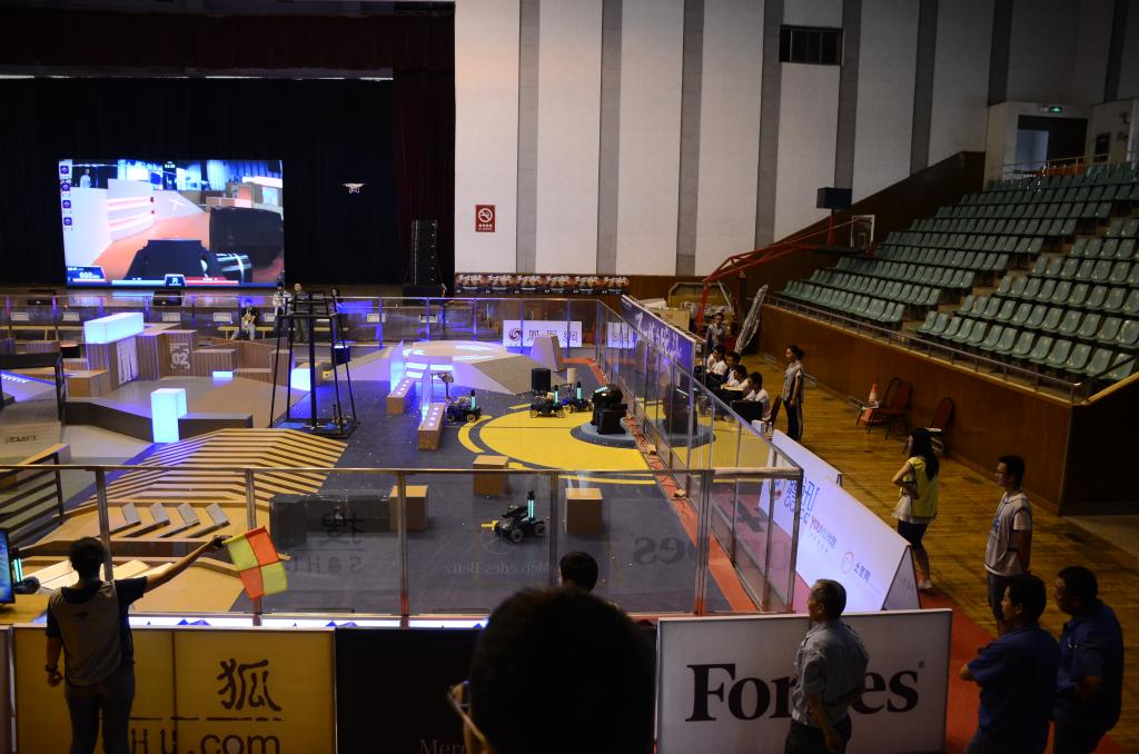 競賽隊伍分為紅、藍兩方,雙方均有6個機器人組成各自戰(zhàn)隊,包括1個炮手(裝備大口徑彈丸負責重型打擊),2個射手(負責機動打擊),2個騎兵(負責偵查和輕型打擊),1個哨兵(負責觀察敵情)。參賽隊員們通過高清視頻遠程遙控,操控機器人戰(zhàn)隊在一個設(shè)計制作了瞭望塔、戰(zhàn)壕、橋梁、洞穴和樓宇的模擬作戰(zhàn)場地中,完成機動行走、跨越障礙、埋伏狙擊等復雜動作,并要在行動中使用機炮實施打擊,降低對手“生命值”(機器人身后附帶的可視血條裝置),成功攻占其基地的一方勝出。同時還要完成自身的子彈補給、“生命值”補充等任務(wù)。