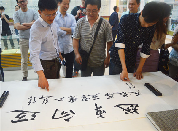 隨后,師生們一起參觀了我校校史館以及西安校區(qū),校友們看到西安校區(qū)氣勢恢宏的教學樓群、圖書館,自豪感油然而生,校友代表趙永杰揮毫潑墨,寫下了“邁向卓越”四個大字來表達他們的良好心愿。之后,院長劉建科以及在場師生們在一號教學樓前合影留念。