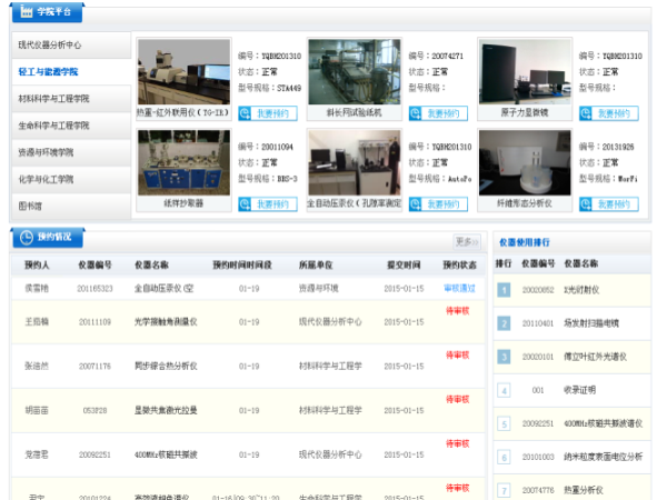 我校大型儀器設(shè)備開(kāi)放共享系統(tǒng),以提高設(shè)備投資效益為目的,打破了空間限制、地域界限、部門界限,實(shí)現(xiàn)了儀器預(yù)約、實(shí)時(shí)監(jiān)控、設(shè)備維修、在線交流、數(shù)據(jù)統(tǒng)計(jì)等功能,很好的解決了以往我校實(shí)驗(yàn)室管理工作中的各項(xiàng)疑難問(wèn)題。通過(guò)網(wǎng)上預(yù)約管理系統(tǒng),提高了設(shè)備儀器的使用率,有效避免了設(shè)備重復(fù)購(gòu)置,實(shí)現(xiàn)了實(shí)驗(yàn)室資源開(kāi)放共享,通過(guò)實(shí)驗(yàn)室工作和設(shè)備量化考核,加強(qiáng)并規(guī)范了實(shí)驗(yàn)室建設(shè)和管理,為實(shí)驗(yàn)教學(xué)和科學(xué)研究提供了良好的服務(wù)平臺(tái)。