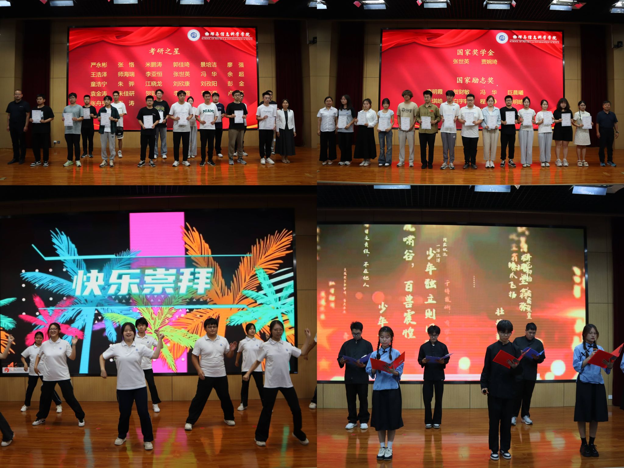 表彰大會以“青春逐夢、榮耀同行”為主題,通過四個篇章,生動展現(xiàn)了物理學子在青春賽道上奮勇拼搏的精彩畫卷。第一篇章“揚帆起航——做敢想敢為的新青年”,表彰了在閱讀、文藝、體育等方面表現(xiàn)突出的同學,“閱讀之星”“文藝之星”“體育之星”等榮譽,詮釋了青春的無限可能。第二篇章“勤學善思——做只爭朝夕的新青年”,表彰了在班團建設(shè)等方面表現(xiàn)突出的集體,“先進團支部”“優(yōu)秀班集體”“優(yōu)秀宿舍”等榮譽,彰顯了團隊協(xié)作的強大凝聚力;第三篇章“奮楫篤行——做追光逐電的新青年”,表彰了在學業(yè)和科技創(chuàng)新方面獲“國家獎學金”“優(yōu)秀科創(chuàng)獎”的同學,他們是科研創(chuàng)新的排頭兵。第四篇章“長風萬里——做志存高遠的新青年”,表彰了畢業(yè)生在考研、就業(yè)和學生工作等方面取得的成績,“考研之星”“就業(yè)之星”“優(yōu)秀畢業(yè)生”“優(yōu)秀畢業(yè)生學生干部”等榮譽,是對他們大學時光努力的最好肯定。