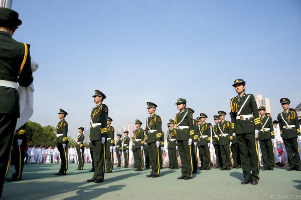 熱浪席卷運動會賽場,所到陰涼之處盡是人群,唯有一支來自我校的國旗護衛(wèi)隊,由32名隊員組成的他們,無人缺席。他們一一身著整齊的制服,將自己昂首挺胸的身姿立于烈日之下。