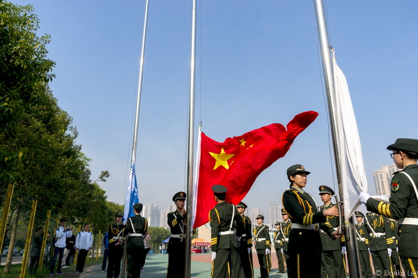 開幕式上,他們是運動方陣的開場嘉賓,是守護國旗的“校園天使”,在激揚的國歌伴奏中和同學(xué)們的集體注視下,升起手中的旗幟,一展運動雄風(fēng)氣息。之后,又立馬化身為“最佳守門員”,嚴(yán)格把控外來人員進(jìn)出運動會場的秩序,雖面容嚴(yán)肅,寡言少語,可這恰恰是他們工作態(tài)度的最真誠的彰顯。