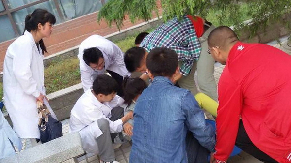 4月23日上午10點多鐘,1號教學(xué)樓F座樓前上演驚心一幕:一名資源與環(huán)境學(xué)院的女生不慎從石凳上摔下,頭部直接觸地,當(dāng)時就發(fā)生了抽搐,所幸是得到路人通知的醫(yī)療救護隊立即趕到,對她進(jìn)行了及時的救護。