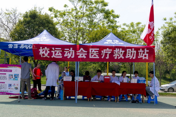 處理完這些之后,幾名醫(yī)護人員又趕回了熱鬧的運動場,這里有一個藍(lán)色的帳篷,里面配備有氧氣袋、擔(dān)架和醫(yī)療救助箱等救援器材,隨時準(zhǔn)備救助賽場上受傷的運動員和觀眾。這是由校醫(yī)院和匯?;饡?lián)合成立的一支醫(yī)療救助隊,除了一名醫(yī)生和一名護士,其余的15個人都是匯?;饡拇髮W(xué)生志愿者。從去年開始,他們就成為運動會的駐場組織,還會不定期派人在賽場上巡邏,以便及時為師生們提供醫(yī)療救助服務(wù)。
