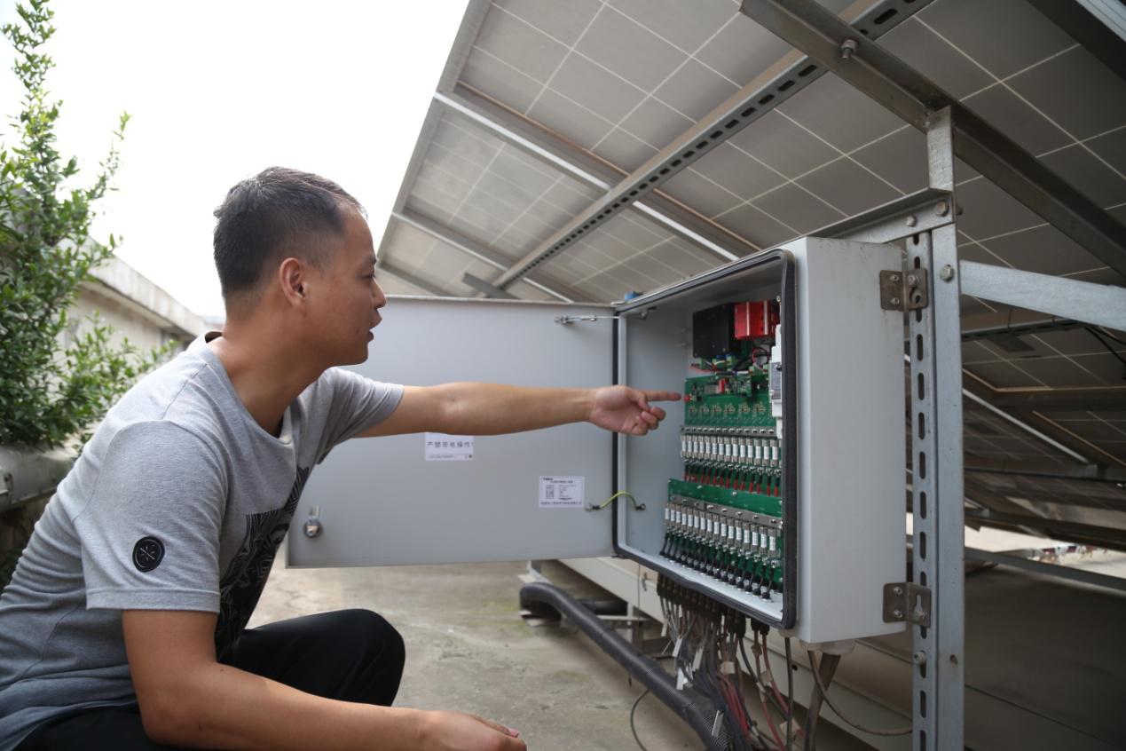太陽能發(fā)電板的背后裝有光伏陣列匯流箱,一個樓頂?shù)陌l(fā)電板配備2個這樣的裝置。巡查過程中,種馬剛必須打開這個箱子,通過里面的數(shù)碼管顯示器,查看每一路光伏電池組串的電流、電壓和溫度情況,據(jù)此確定設(shè)備是否正常運轉(zhuǎn)。