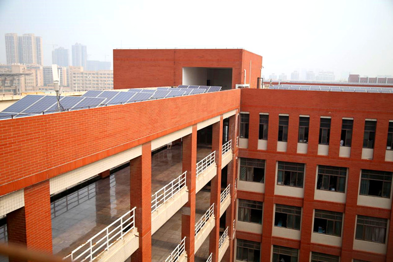 站在陜西科技大學1號教學樓頂,從A座到F座放眼望去,一片片光伏組件陣列靜靜地矗立在陽光之下,仿若一片藍色的海洋,在安然的表面下卻蘊藏流轉(zhuǎn)著巨大的能量。這就是目前國內(nèi)高校裝機容量最大的屋頂光伏電站——陜西科技大學光伏電站。自2012年11月起開始建設(shè)至2013年2月正式并網(wǎng)發(fā)電,這座建在教學樓頂?shù)男履茉窗l(fā)電站,迄今已累計發(fā)電150多萬度,累計減排二氧化碳1500多噸,年均發(fā)電量60多萬度。