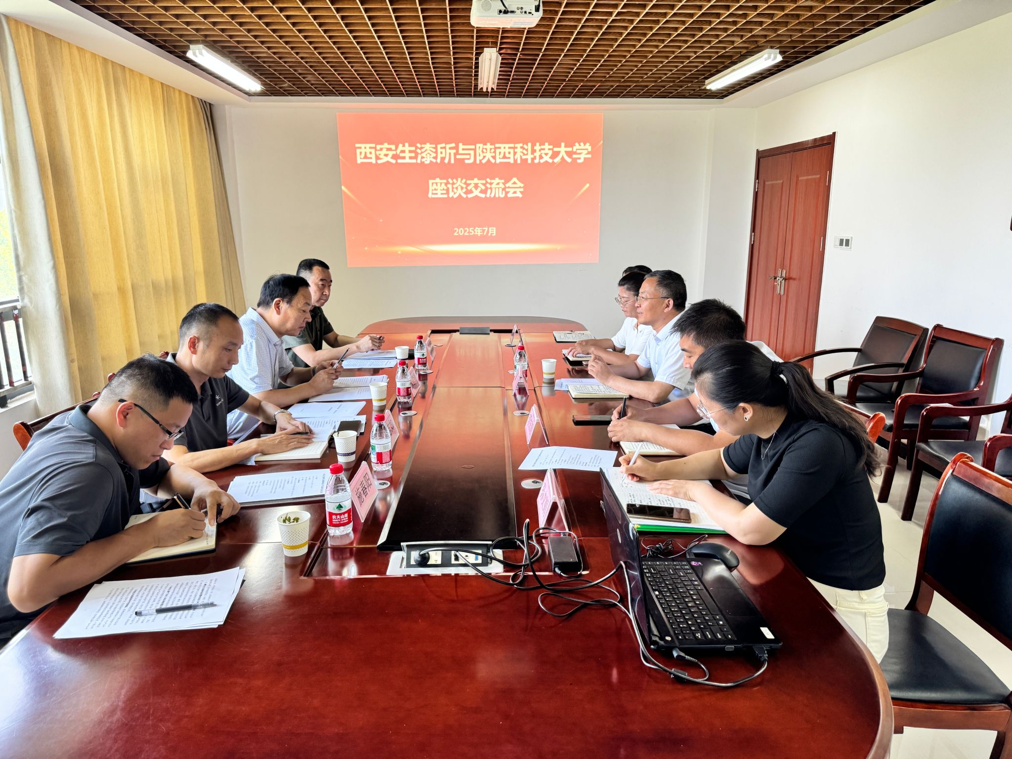 7月14日,陜西科技大學科技處處長朱建鋒率隊赴西安生漆涂料研究所開展合作對接交流,前沿科學與技術轉移研究院副院長李志如、陜西農產品加工技術研究院主任施春陽及商南東正集團董事長任戰(zhàn)洲等一同參加。西安生漆涂料研究所黨委書記、所長趙瑞及相關負責人熱情接待并參與座談。此次交流旨在進一步推動產學研深度融合,助力陜西生漆產業(yè)傳承創(chuàng)新與高質量發(fā)展。