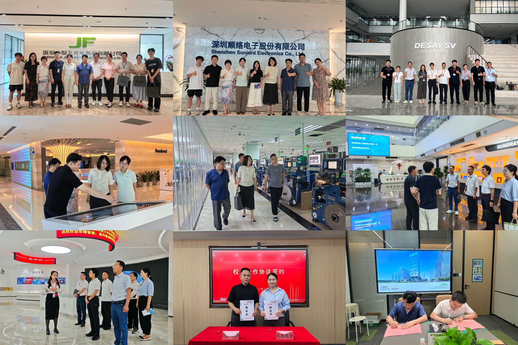 在拓展校企合作與產(chǎn)業(yè)調(diào)研方面,團(tuán)隊(duì)圍繞新型顯示技術(shù)、集成電路、半導(dǎo)體、汽車電子等領(lǐng)域,實(shí)地考察了包括深圳市兆馳股份有限公司、深圳和美精藝半導(dǎo)體科技股份有限公司、勝科納米(深圳)有限公司、深圳順絡(luò)電子股份有限公司、深圳聚飛光電股份有限公司、德賽西威汽車電子股份有限公司、廣東利元亨智能裝備股份有限公司、信銳網(wǎng)科技術(shù)有限公司、中南國(guó)際科技發(fā)展(深圳)有限公司、深圳市圖興科技有限公司等16家企業(yè)。通過(guò)參觀企業(yè)展廳、生產(chǎn)線,聽(tīng)取企業(yè)介紹,團(tuán)隊(duì)深入了解了行業(yè)發(fā)展趨勢(shì)、技術(shù)前沿動(dòng)態(tài)及具體崗位能力需求。校企雙方圍繞提升人才培養(yǎng)精準(zhǔn)度,就課程體系優(yōu)化、實(shí)踐教學(xué)強(qiáng)化、實(shí)習(xí)就業(yè)基地共建、定向崗位開(kāi)拓等議題展開(kāi)了務(wù)實(shí)討論,旨在將產(chǎn)業(yè)需求融入培養(yǎng)方案,提升學(xué)生就業(yè)競(jìng)爭(zhēng)力。