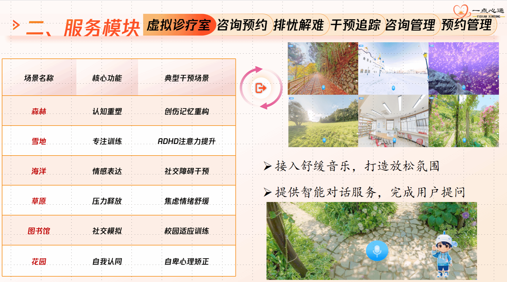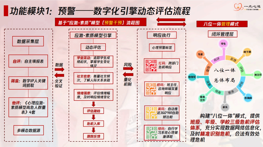 該平臺(tái)通過(guò)數(shù)智技術(shù)構(gòu)建了“預(yù)警-服務(wù)-教育”三級(jí)聯(lián)動(dòng)機(jī)制,八大角色前后銜接,協(xié)同構(gòu)建心理健康教育模式閉環(huán)。在預(yù)警模塊,自主研發(fā)“心理危機(jī)篩查核心引擎”,首創(chuàng)心理“應(yīng)激-素質(zhì)”評(píng)估模型,結(jié)合多模態(tài)情緒數(shù)據(jù)監(jiān)測(cè)等技術(shù),實(shí)現(xiàn)心理問(wèn)題分層預(yù)警及動(dòng)態(tài)實(shí)時(shí)賦碼,解決鄉(xiāng)村心理問(wèn)題學(xué)生篩不準(zhǔn)困境;在服務(wù)模塊,通過(guò) AR現(xiàn)實(shí)增強(qiáng)技術(shù)創(chuàng)設(shè)6類(lèi)3D心理干預(yù)場(chǎng)景,打造低成本“沉浸式移動(dòng)心空間”,并搭建隱秘式“排憂解難”論壇,提供專業(yè)的心理問(wèn)題疏導(dǎo)與咨詢服務(wù),解決心理問(wèn)題干預(yù)方式低數(shù)字困境;在教育模塊,利用人工智能技術(shù)打造 IP 心理學(xué)伴,集成自然語(yǔ)言處理(NLP)技術(shù)等自動(dòng)觸發(fā)學(xué)伴的主動(dòng)關(guān)懷機(jī)制,同時(shí)攜手心理專家研發(fā)特色網(wǎng)絡(luò)課程,通過(guò)開(kāi)發(fā)項(xiàng)目式課程、案例式課程、游戲式課程,解決心理健康教育缺師資困境,實(shí)現(xiàn)心理問(wèn)題從精準(zhǔn)預(yù)警到科學(xué)干預(yù)、從教育培訓(xùn)到心理素養(yǎng)提升的全流程服務(wù)?!耙稽c(diǎn)心通”數(shù)字化教育平臺(tái)以中小學(xué)生為核心服務(wù)群體,通過(guò)教師、家長(zhǎng)、班主任、德育主任詢師及教育行政部門(mén)等八位一體布局,共同擴(kuò)大“一點(diǎn)心通”平臺(tái)使用范圍,形成中小學(xué)心理健康服務(wù)體系。