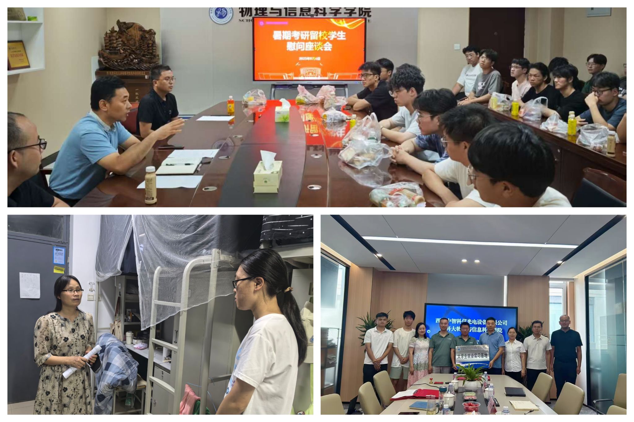 聚焦學(xué)生需求,延伸育人“服務(wù)鏈”。針對暑期考研學(xué)生復(fù)習(xí)場地緊張的問題,學(xué)院積極協(xié)調(diào)實(shí)驗(yàn)室、會議室等空間開辟為考研自習(xí)室,并配備桌椅、飲用水、網(wǎng)絡(luò)等基礎(chǔ)物資,為學(xué)生提供安靜便捷的學(xué)習(xí)環(huán)境。假期中段,學(xué)院專門召開“暑期考研留校學(xué)生慰問座談會”,院領(lǐng)導(dǎo)、系主任及輔導(dǎo)員與學(xué)生親切交流,傾聽備考困惑與需求,既為大家加油鼓勁,也送上貼心慰問品,讓學(xué)生在專注復(fù)習(xí)時更能感受到學(xué)院的溫暖。同時,學(xué)院專程前往中智科儀等企業(yè),看望慰問暑期在企實(shí)習(xí)學(xué)生,實(shí)地了解他們的實(shí)習(xí)環(huán)境與實(shí)際需求,為學(xué)生實(shí)習(xí)實(shí)踐全程保駕護(hù)航。