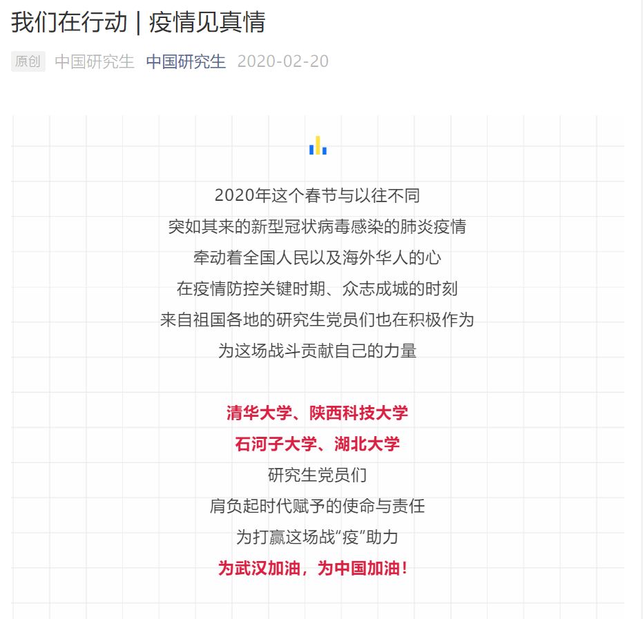 近日,中國(guó)研究生微信公眾號(hào)報(bào)道了我校研究生黨員在疫情斗爭(zhēng)期間肩負(fù)時(shí)代賦予的使命與責(zé)任,積極作為,為打贏這場(chǎng)戰(zhàn)“疫”助力,為武漢加油、為中國(guó)加油。