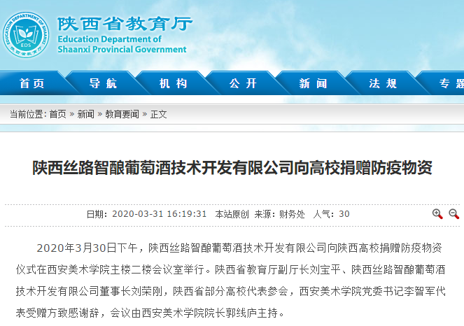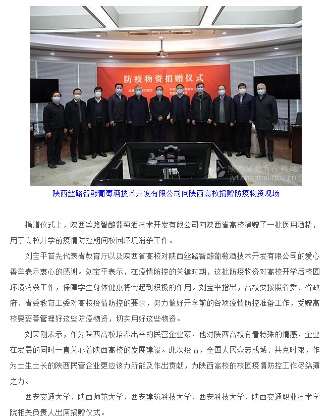 3月31日,陜西省教育廳官網(wǎng)報(bào)道了我校校友、陜西絲路智釀葡萄酒技術(shù)開發(fā)有限公司董事長(zhǎng)劉榮剛向高校捐贈(zèng)防疫物資,全文鏈接如下:http://jyt.shaanxi.gov.cn/jynews/jyyw/202003/31/100303.html