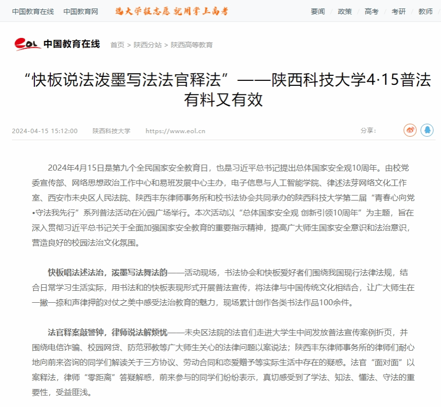 中國(guó)教育在線:“快板說法潑墨寫法法官釋法”——陜西科技大學(xué)4·15普法有料又有效