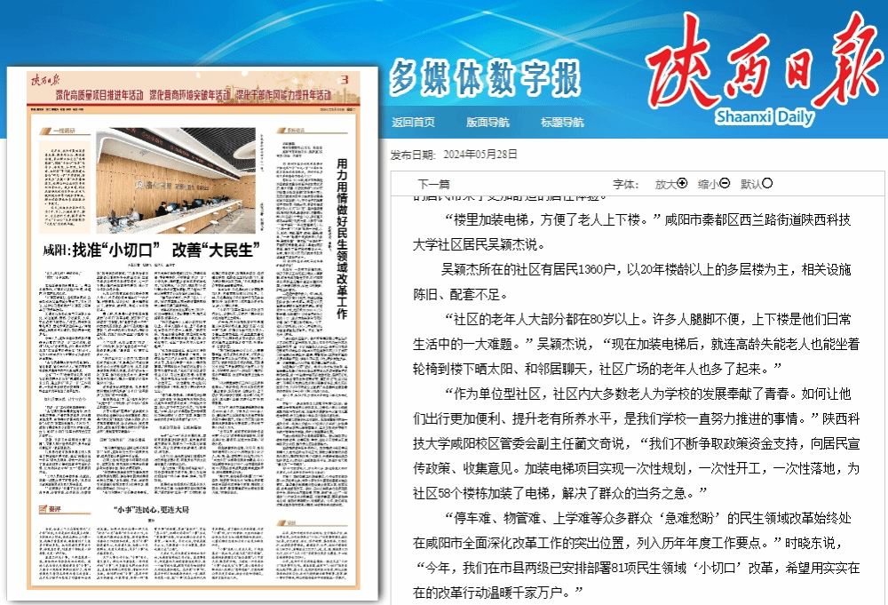 近日,《陜西日報》報道我校咸陽校區(qū)家屬樓電梯加裝工作。