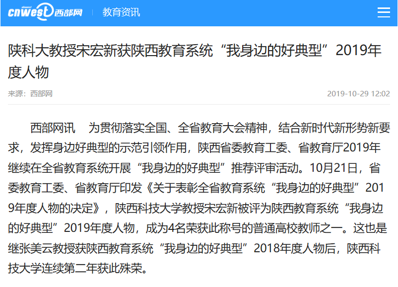 10月29日,《西部網(wǎng)》報(bào)道了我校教師宋宏新教授獲陜西教育系統(tǒng)“我身邊的好典型”2019年度人物,全文鏈接如下:http://m.cnwest.com/jyzx/a/2019/10/29/18118402.html