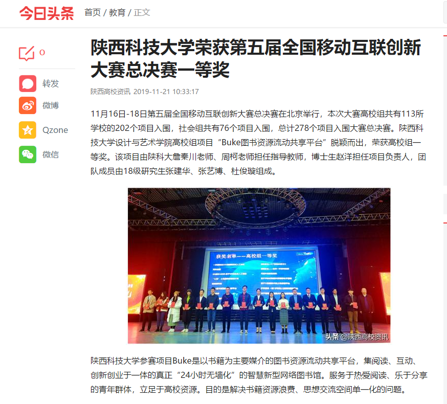 今日頭條App報(bào)道:陜西科技大學(xué)榮獲第五屆全國(guó)移動(dòng)互聯(lián)創(chuàng)新大賽總決賽一等獎(jiǎng)