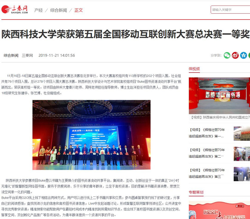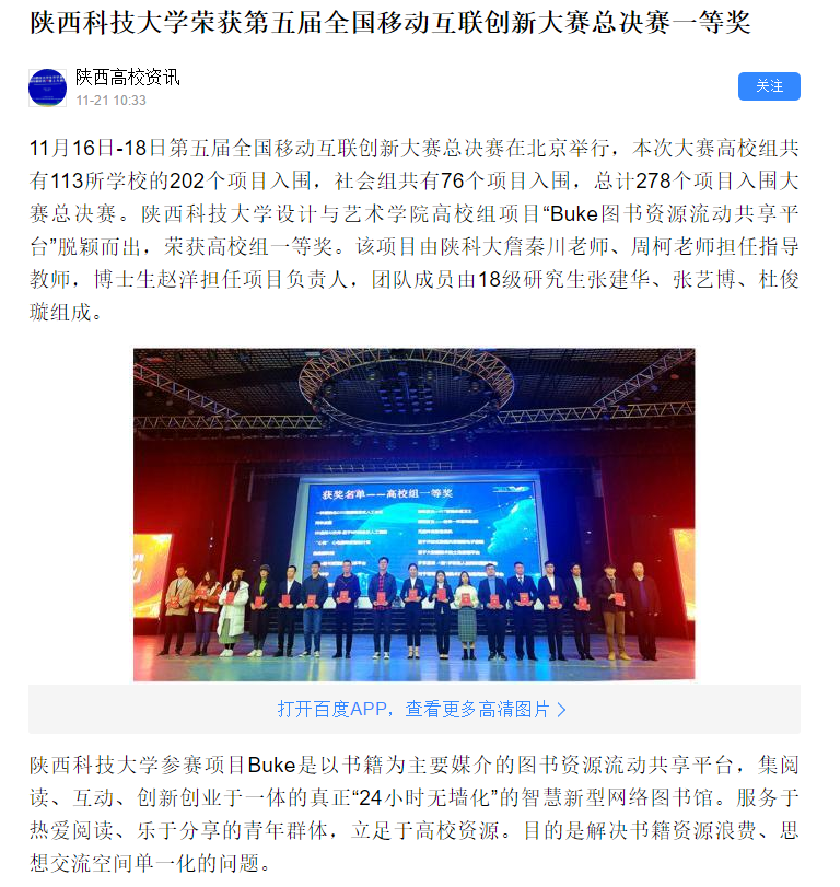 百度APP報(bào)道:陜西科技大學(xué)榮獲第五屆全國(guó)移動(dòng)互聯(lián)創(chuàng)新大賽總決賽一等獎(jiǎng)