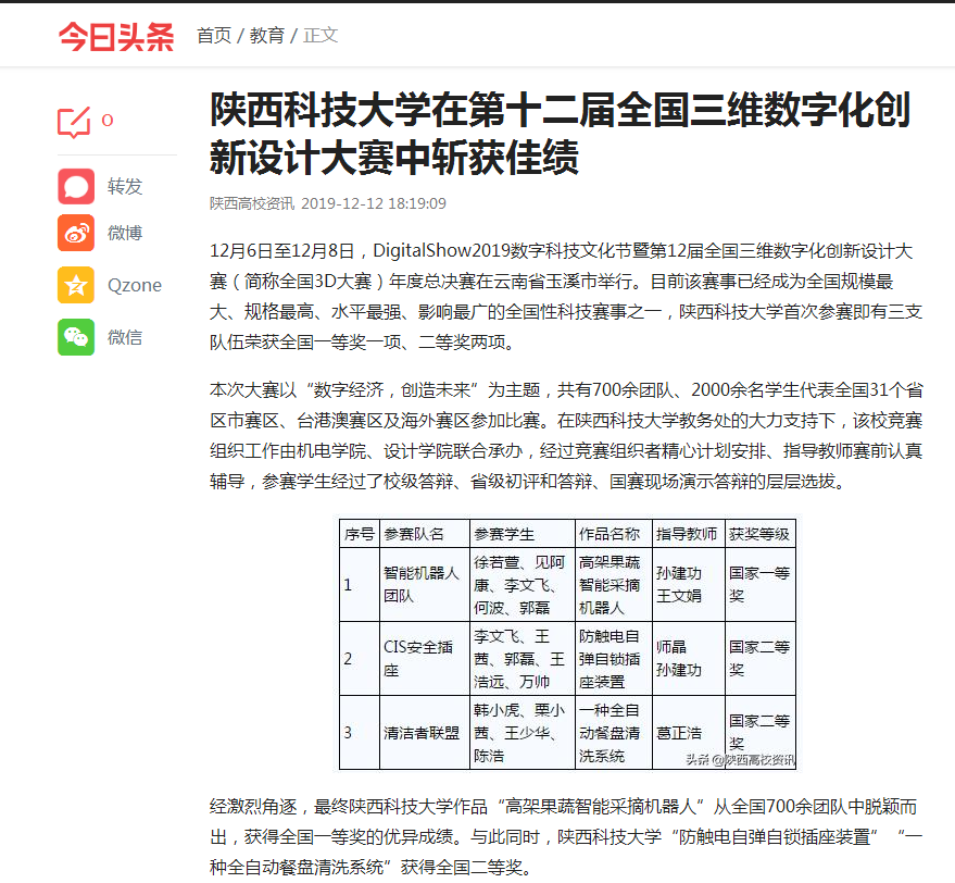 今日頭條APP:陜西科技大學(xué)在第十二屆全國(guó)三維數(shù)字化創(chuàng)新設(shè)計(jì)大賽中斬獲佳績(jī)