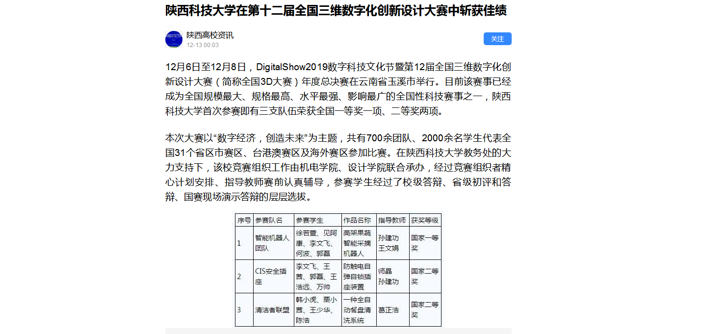 人民日?qǐng)?bào)APP等媒體報(bào)道:陜西科技大學(xué)在第十二屆全國(guó)三維數(shù)字化創(chuàng)新設(shè)計(jì)大賽中斬獲佳績(jī)