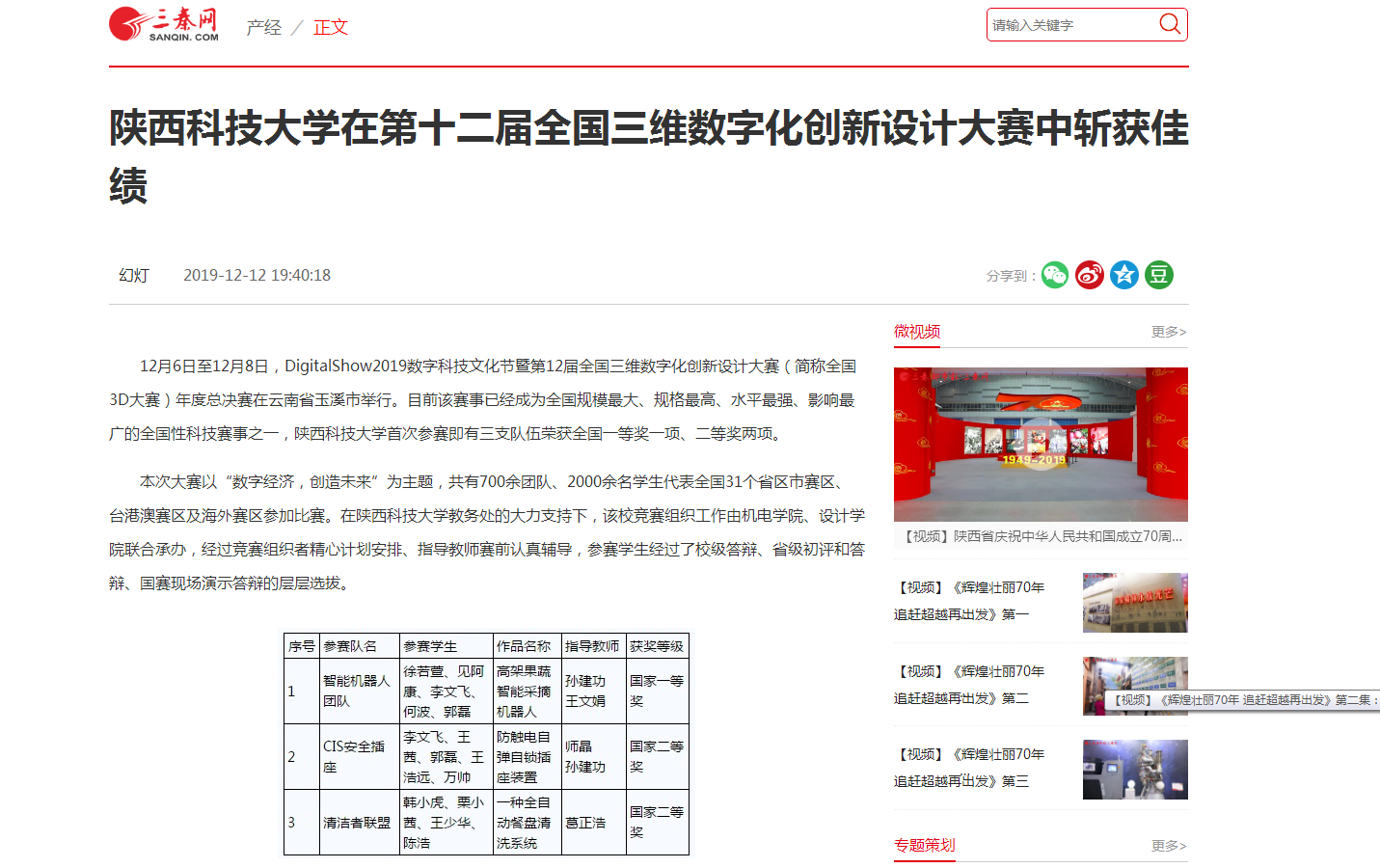 三秦網(wǎng):陜西科技大學(xué)在第十二屆全國(guó)三維數(shù)字化創(chuàng)新設(shè)計(jì)大賽中斬獲佳績(jī)