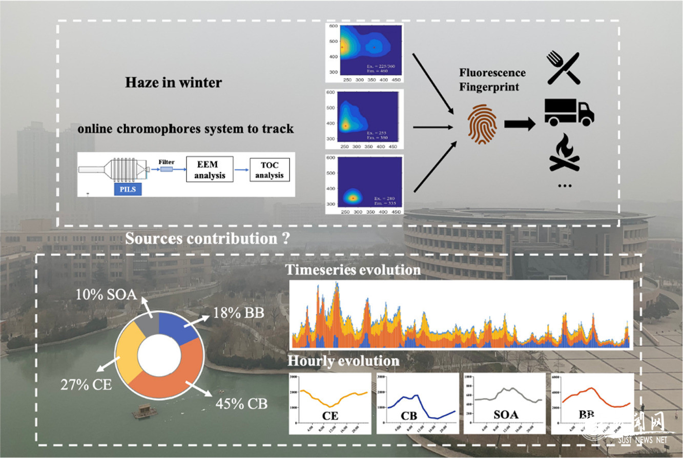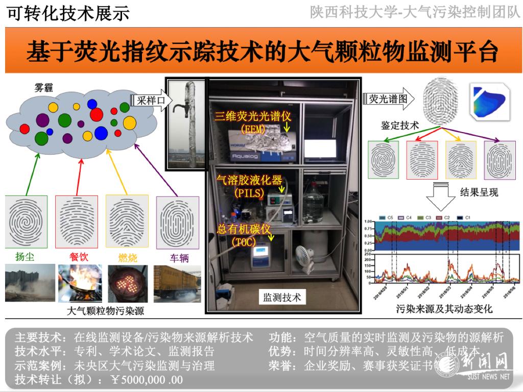 該課題研究歷時三年,得到了國家自然科學基金項目(41703102、41877354),陜西科技大學“青年拔尖”啟動經(jīng)費等資金支持。主要分為兩方面的工作:一是技術方面,開發(fā)了基于熒光指紋示蹤的大氣PM2.5化學組分分析、大氣化學反應機制探討、大氣污染來源鑒定的技術方法;二是設備方面,實現(xiàn)了大氣PM2.5在線捕獲系統(tǒng)(PILS)與三維熒光光譜(EEM)、總有機碳分析儀(TOC)的串聯(lián)并用。綜合以上兩方面的技術和硬件平臺,最終實現(xiàn)了大氣污染物在線監(jiān)測和來源解析的功能,獲得數(shù)據(jù)可應用于精確了解大氣污染物的起源、揭示污染產(chǎn)生和消失機制,最終服務區(qū)域大氣污染的治理。團隊以陜科大大氣監(jiān)測站點為中心,利用該監(jiān)測設備已相繼開展了“冬季霧霾形成過程與成因解析”“春季沙塵暴發(fā)生觀測與空氣質(zhì)量影響分析”“夏季大氣污染物化學反應機制”等具體研究。