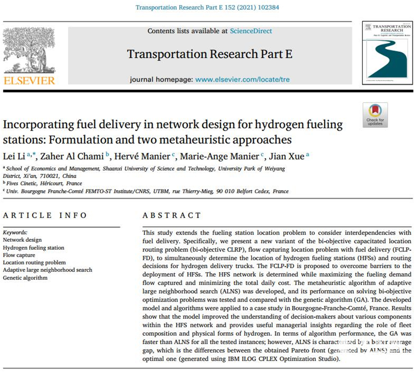 “Incorporating fuel delivery in network design for hydrogen fueling stations: Formulation and two metaheuristic approaches”以氫能交通在全球的迅速發(fā)展為背景,針對(duì)氫能基礎(chǔ)設(shè)施建設(shè)的瓶頸--加氫站選址及氫源問題,提出充分利用現(xiàn)有設(shè)施及資源的解決辦法。為尋找最優(yōu)方案,論文建立了雙目標(biāo)帶容量約束的選址路徑模型,即考慮燃料供應(yīng)的流量捕捉選址模型。求解方面,論文針對(duì)模型的特點(diǎn),設(shè)計(jì)了兩套元啟發(fā)式算法,分別為自適應(yīng)大鄰域搜索算法以及遺傳算法。研究結(jié)果表明,論文建立的優(yōu)化模型能夠幫助地區(qū)決策者選擇最適合自身發(fā)展條件的加氫站建設(shè)方案,設(shè)計(jì)的元啟發(fā)式算法可以大幅縮減運(yùn)算時(shí)間,并給出符合精度要求的結(jié)果。
