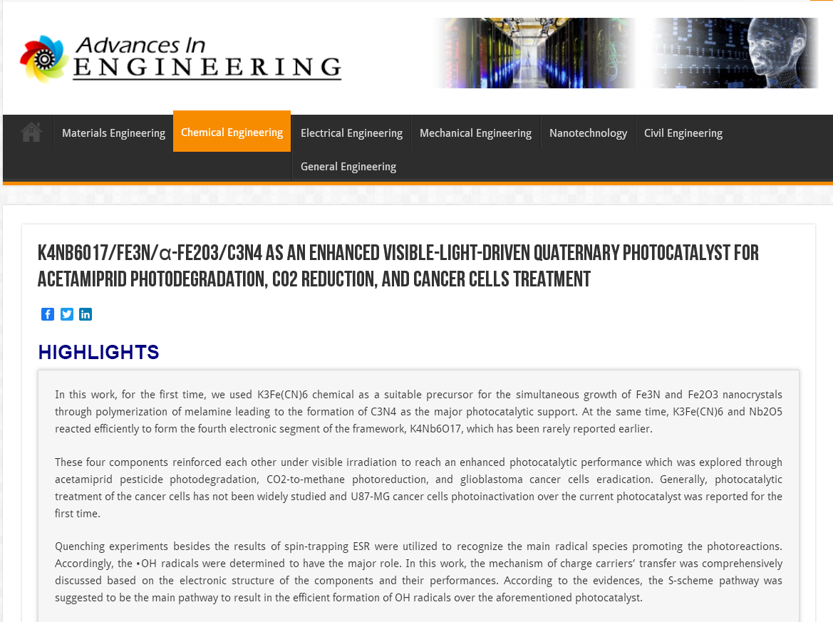 Advances in Engineering報道鏈接:https://advanceseng.com/k4nb6o17-fe3n-%ce%b1-fe2o3-c3n4-enhanced-visible-light-driven-quaternary-photocatalyst-acetamiprid-photodegradation-co2-reduction-cancer-cells-treatment/