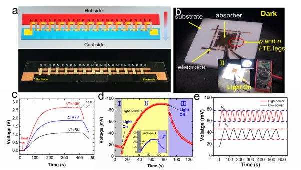 研究人員開發(fā)了基于離子熱電效應(yīng)的無接觸式自供電熱智能探測器,在較寬的光、熱刺激范圍內(nèi)展現(xiàn)出優(yōu)異的響應(yīng)特性、可重復(fù)性和高靈敏度。同時,研究人員開發(fā)出由13對P-N熱電臂組成的平面式熱傳感器,該傳感器在10K溫差下可產(chǎn)生2.5V電壓且具備高穩(wěn)定性。