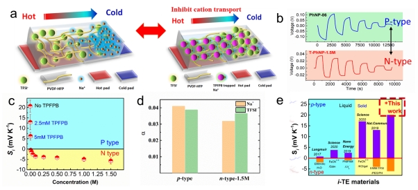 (a) P-N型轉(zhuǎn)換調(diào)控示意圖,(b)電壓響應(yīng)方向?qū)Ρ葓D,(c)P型至N型塞貝克系數(shù)變化圖,(d)P型和N型離子產(chǎn)生熵變圖,(e)已報道的P-N型塞貝克系數(shù)范圍對比圖。