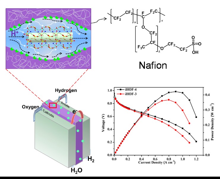 我?;瘜W(xué)與化工學(xué)院曹麗慧教授開展的研究工作利用酸性與堿性有機分子構(gòu)筑酸堿對的原理制備雙組分離子型HOFs材料,通過離子交換反應(yīng)制備了具有DBpy·2I和萘二磺酸化合物的四種雙組分離子型HOF。研究結(jié)果表明,具有不同磺酸基配體位置的四種iHOF顯示出四種不同的氫鍵結(jié)構(gòu)。阻抗譜測量表明,iHOF-3和iHOF-4的質(zhì)子電導(dǎo)率可以分別達到1.16 × 10-3和2.76 × 10-3S·cm-1。iHOF/Nafion復(fù)合膜作為固體電解質(zhì)的燃料電池測試初步研究表明,6%-iHOF-4/Nafion的最大功率密度可達到0.42 W·cm-2,6%-iHOF-3/Nafion可達到0.36 W·cm-2。隨著對此類材料的進一步研究,將會設(shè)計出更多具有高質(zhì)子傳導(dǎo)性的iHOFs,這將在燃料電池領(lǐng)域顯示出巨大的潛力。