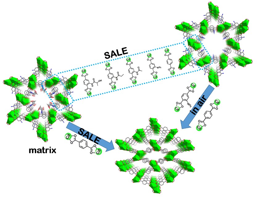 金屬有機框架(MOF)作為一類功能性多孔晶態(tài)框架材料,由于其可控的結(jié)構(gòu)和潛在的應(yīng)用,引起了人們的廣泛關(guān)注。其結(jié)構(gòu)的修飾與改良,性質(zhì)功能的調(diào)控和提升一直是該領(lǐng)域的研究重點。近幾年科學(xué)家們開發(fā)了一種通過逐步反應(yīng)實現(xiàn)配位聚合物多功能化的復(fù)雜合成策略——溶劑輔助連接體交換(SALE)。溶劑輔助連接體交換是指將配位聚合物作為母體加入到含有高濃度的外加有機配體溶液中反應(yīng),外加配體替換原配合物中的配體形成與母體具有相似框架的產(chǎn)物。通過合成后修飾(PSM)策略可以合成更復(fù)雜和多功能化的MOF材料。此外,由于其獨特的物理化學(xué)性能與結(jié)構(gòu)息息相關(guān),MOF材料在外部條件的刺激下可能會發(fā)生結(jié)構(gòu)轉(zhuǎn)變。作為研究結(jié)構(gòu)改變引起性能變化的理想模型,功能性晶態(tài)框架MOF材料在光、熱、壓力或pH值等外部刺激作用下結(jié)構(gòu)和性質(zhì)上的開關(guān)行為吸引了科學(xué)家們越來越多的關(guān)注。