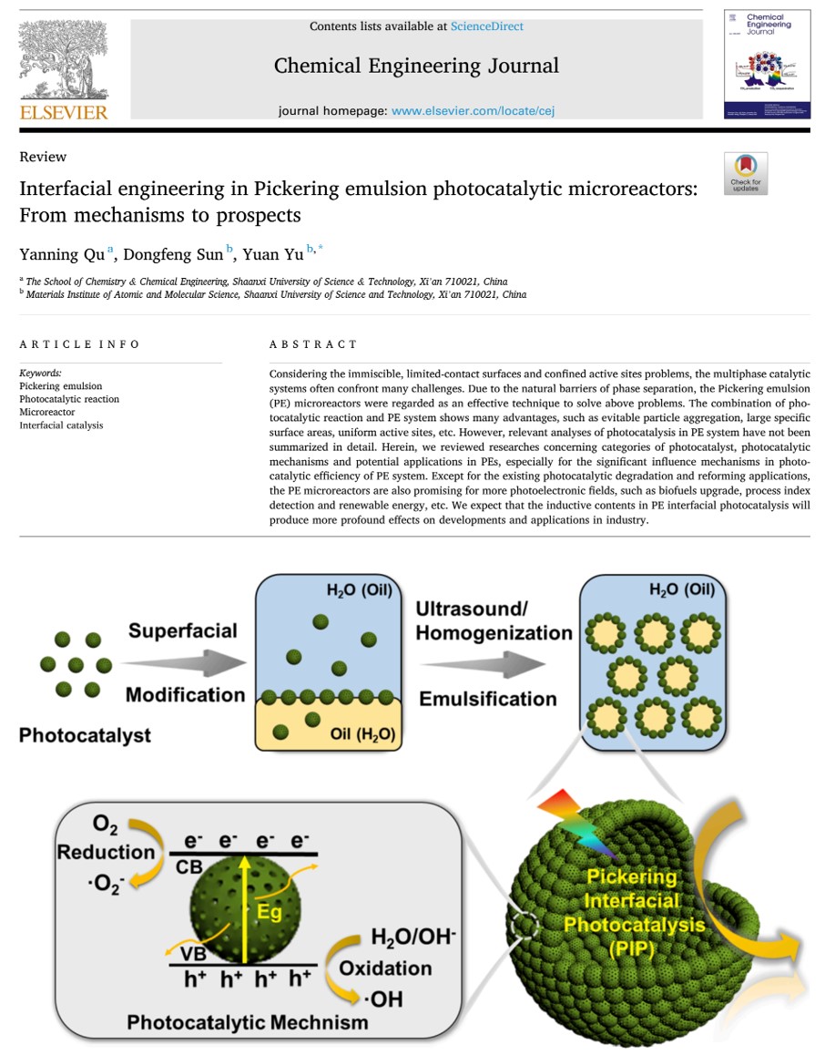 近日,化學(xué)與化工學(xué)院青年教師屈彥寧博士在著名化工期刊《Chemical Engineering Journal》(影響因子16.744)上發(fā)表文章“Interfacial engineering in Pickering emulsion photocatalytic microreactors: From mechanisms to prospects”。