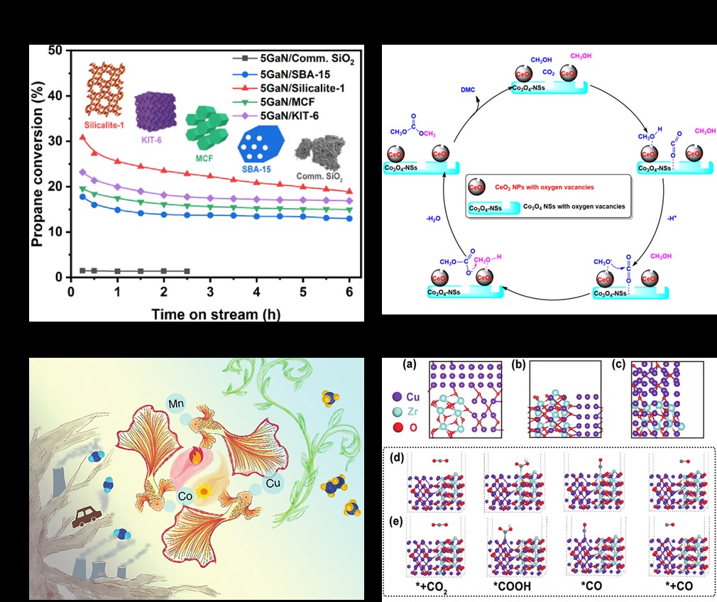 圖1 CO2催化轉(zhuǎn)化體系開發(fā):(a)GaN/SiO2催化CO2氧化丙烷脫氫,(b)Ce-NPs/Co-NSs催化CO2和甲醇合成DMC,(c)Co-Cu-Mn三金屬光熱催化CO2加氫反應(yīng)和(d)ZrO2/Cu-Cu2O電催化CO2制備乙烯