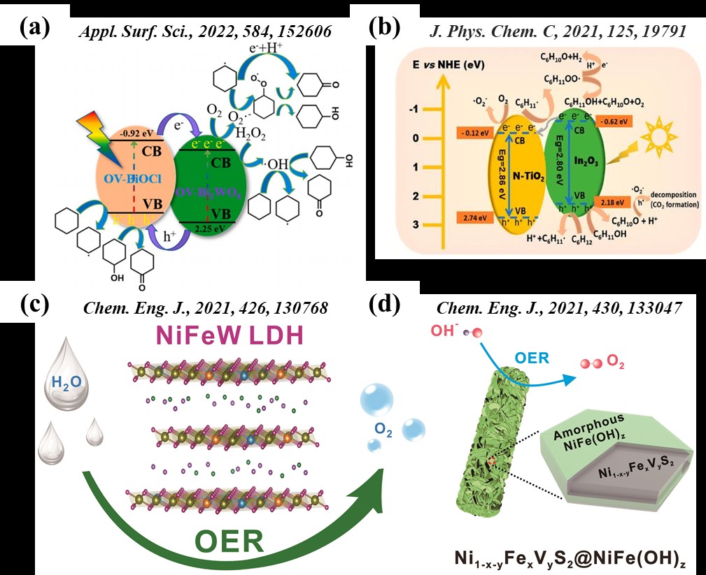圖2 環(huán)己烷氧化體系開發(fā):(a)Bi2WO6/BiOCl光催化環(huán)己烷氧化制KA油;(b)In2O3/N-TiO2光催化環(huán)己烷氧化高選擇性制環(huán)己酮。電解水體系開發(fā):(c)NiFeW LDH作為OER反應(yīng)的高效電催化劑;(d)核殼Ni1-x-yFexVyS2@NiFe(OH)z作為OER反應(yīng)的高效電催化劑