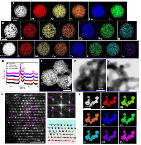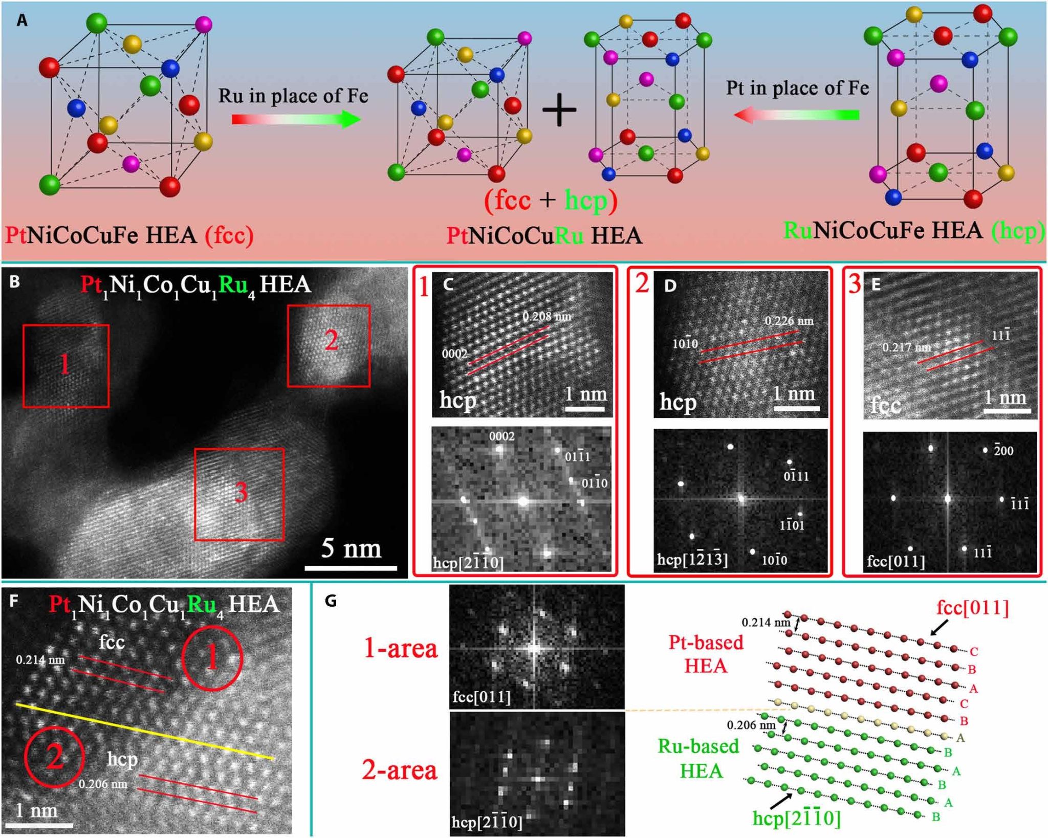 團(tuán)隊(duì)還深入探究了相關(guān)形成機(jī)制,發(fā)現(xiàn) Pt、Ru、Ir 等貴金屬元素可降低過(guò)渡金屬還原溫度,促進(jìn)單相固溶體形成,為優(yōu)化材料性能提供理論依據(jù)。同時(shí),通過(guò)調(diào)整 Pt 與 Ru 比例和還原溫度,借助原位掃描透射電子顯微鏡和密度泛函理論計(jì)算,首次實(shí)現(xiàn)同一納米顆粒中 fcc 和 hcp 相結(jié)構(gòu)的精確調(diào)控,為定制材料性能創(chuàng)造可能。