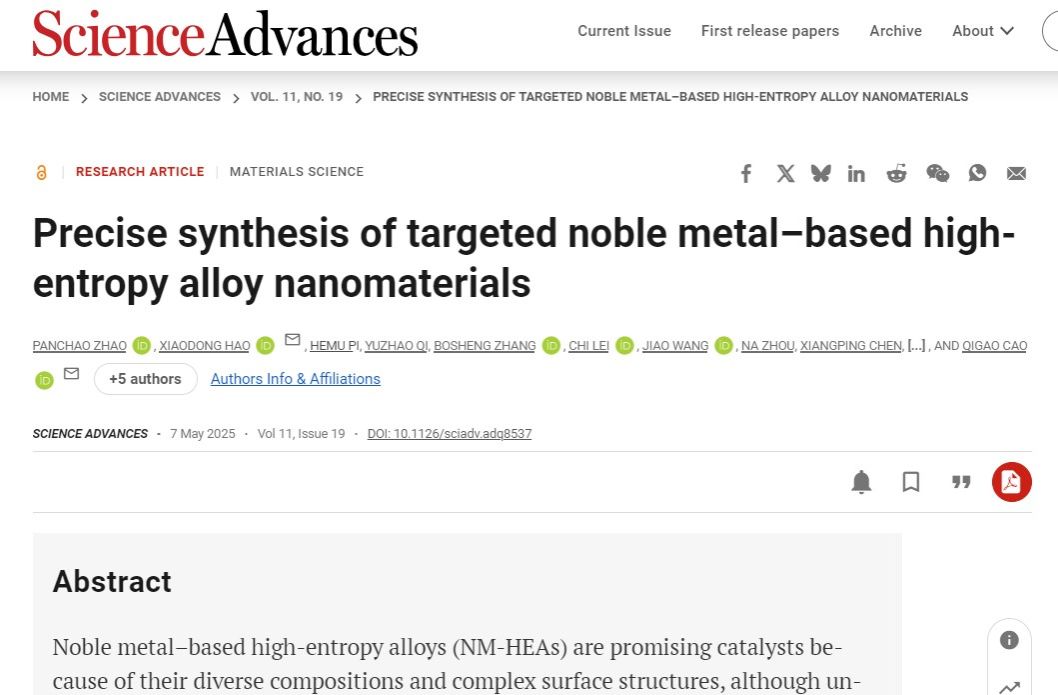 附論文詳細(xì)信息:P. Zhao, X. Hao*, H. Pi, Y. Qi, B. Zhang, C. Lei, J.Wang, N. Zhou, X. Chen, D. Kan*, B. Xu, G. Zhang*, J. Chen*, W. Yi*, Q. Cao*. Precise synthesis of targeted noble metal–based high-entropy alloy nanomaterials, Science Advances, 11, eadq8537 (2025).