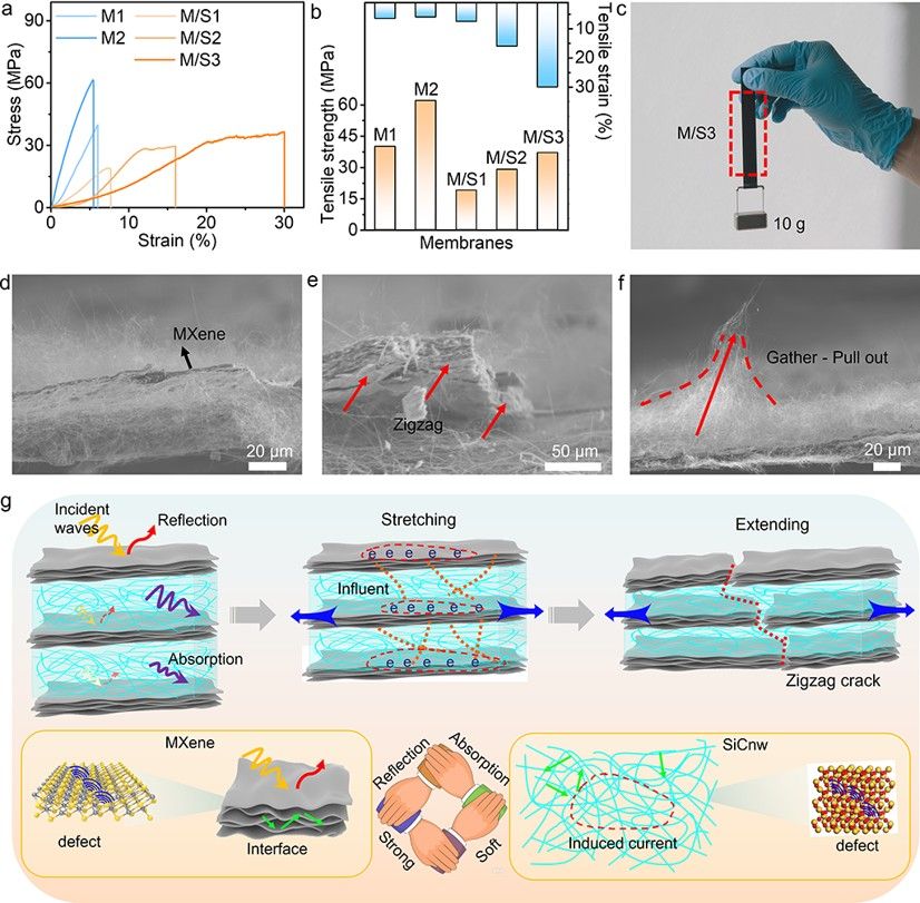 圖4 a) 復(fù)合薄膜的應(yīng)力-應(yīng)變曲線;b) 復(fù)合薄膜的拉伸強度和應(yīng)變;c) 承受10 g重量的M/S3復(fù)合薄膜的照片;d) M/S3復(fù)合薄膜的斷裂行為;e) MXene層的鋸齒狀階梯狀裂紋區(qū)域;f) SiCnw三維網(wǎng)絡(luò)的聚集-拔出;g) M/S3復(fù)合薄膜的拉伸、斷裂和電磁屏蔽機制