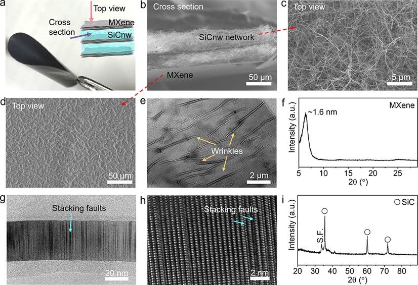 圖2 a) MXene/SiCnw膜的數(shù)碼照片和模型;b) 具有層狀雙電容器結(jié)構(gòu)的MXene/SiCnw膜的橫截面SEM圖像;c) SiCnw三維網(wǎng)絡(luò)的SEM圖像;d) MXene膜的頂視圖;e) 帶有褶皺的MXene納米片的TEM圖像;f) MXene膜的XRD圖譜;g) 具有堆垛層錯的SiCnw的TEM圖像;h) SiCnw的高分辨率TEM圖像;i) SiCnw網(wǎng)絡(luò)的XRD圖譜