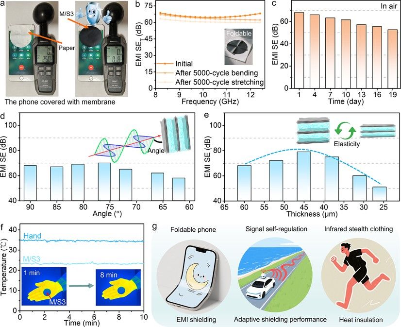 圖5 a) M/S3膜的屏蔽應(yīng)用;b) M/S3膜拉伸彎曲后屏蔽性能的變化;c) M/S3膜隨時間的性能趨勢;d) 不同角度和e) 不同壓縮厚度下M/S3膜的電磁干擾屏蔽性能;f) 隨時間變化的紅外圖像;g) M/S3膜的潛在應(yīng)用