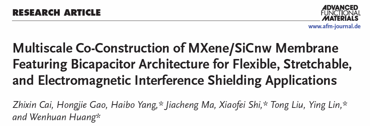 近日,材料科學(xué)與工程學(xué)院楊海波教授團隊,在國際頂級期刊《Advanced Functional Materials》(IF:19)上發(fā)表了題為“Multiscale Co-Construction of MXene/SiCnw Membrane Featuring Bicapacitor Architecture for Flexible, Stretchable, and Electromagnetic Interference Shielding Applications”的研究論文。陜西科技大學(xué)楊海波教授、林營教授、黃文歡教授和中國建筑材料科學(xué)研究總院有限公司石曉飛高級工程師為文章共同通訊作者,陜西科技大學(xué)材料學(xué)院博士后蔡志新為文章第一作者,陜西科技大學(xué)為第一通訊單位。