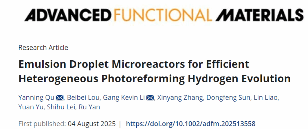 論文詳細(xì)信息:Y. Qu, B. Lou, G. Li, X. Zhang, D. Sun, L. Liao, Y. Yu, S. Lei, R. Yan, Emulsion droplet microreactors for efficient heterogeneous photoreforming hydrogen evolution, Advanced Functional Materials, 2025, e13558. DOI: 10.1002/adfm.202513558.