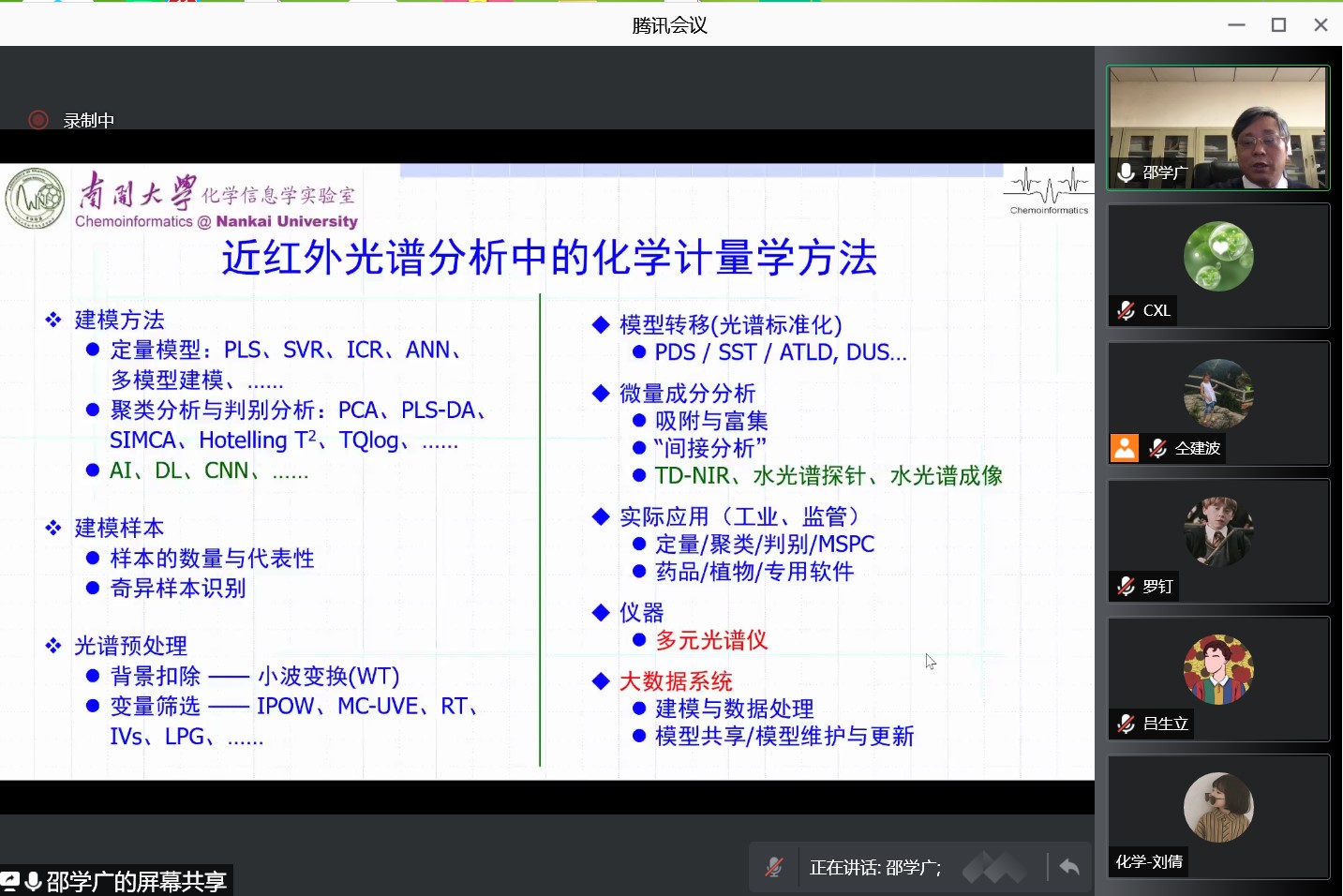 邵學(xué)廣教授主要報(bào)告了采用水的近紅外光譜信號(hào)作為探針分析體系的組成、結(jié)構(gòu)及含量進(jìn)行探測(cè);并介紹了溫控近紅外光譜分析技術(shù)對(duì)目標(biāo)物的含量和結(jié)構(gòu)進(jìn)行分析。重點(diǎn)介紹了將高維數(shù)據(jù)分析方法、化學(xué)計(jì)量學(xué)方法和分子模擬技術(shù)等與水的近紅外光譜結(jié)合分析,實(shí)現(xiàn)了水的不同結(jié)構(gòu)形式以及水光譜的精細(xì)結(jié)構(gòu)信息,并研究了蛋白質(zhì)和聚合物的熱變性過程。報(bào)告最后,邵學(xué)廣教授就師生們對(duì)于FMA算法的局限性、動(dòng)力學(xué)模擬在化學(xué)計(jì)量學(xué)中的應(yīng)用等相關(guān)問題進(jìn)行了細(xì)致解答。