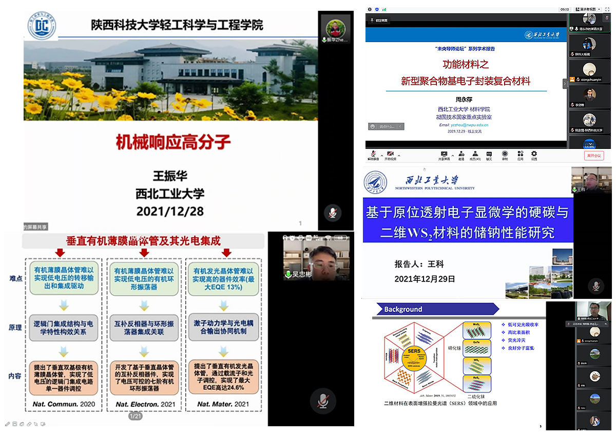 12月28、29日,應(yīng)輕工科學(xué)與工程學(xué)院和研究生院邀請(qǐng),西北工業(yè)大學(xué)柔性電子研究院吳忠彬教授、王振華副教授、王科副研究員和西北工業(yè)大學(xué)材料科學(xué)與工程學(xué)院周永存副教授和黨阿磊副教授做客我?!拔囱雽?dǎo)師論壇”,為學(xué)院師生作了線上系列學(xué)術(shù)報(bào)告。報(bào)告會(huì)由輕工學(xué)院教師熊傳銀副教授主持。