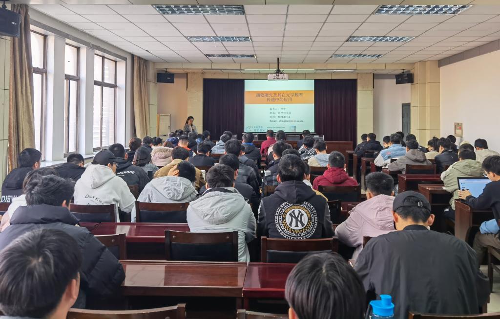 鄧雪介紹了超穩(wěn)激光以及光學(xué)頻率傳遞的基本原理以及當(dāng)前的發(fā)展趨勢(shì),詳細(xì)闡述其中的關(guān)鍵科學(xué)技術(shù)和難點(diǎn),并就超穩(wěn)激光器以及光學(xué)頻率傳遞系統(tǒng)的工程化進(jìn)行詳盡的講解。超穩(wěn)激光具有超高的頻率穩(wěn)定度以及超窄的線寬,使其廣泛應(yīng)用于前沿科學(xué)和工業(yè)領(lǐng)域,例如,引力波探測、相對(duì)論檢驗(yàn)、精密光譜、高精度光學(xué)原子鐘和光學(xué)頻率傳遞等。報(bào)告結(jié)束后,機(jī)電工程學(xué)院師生就超穩(wěn)激光器結(jié)構(gòu)設(shè)計(jì)與制作、工程難題解決方法等,與鄧雪進(jìn)行了深入交流。
