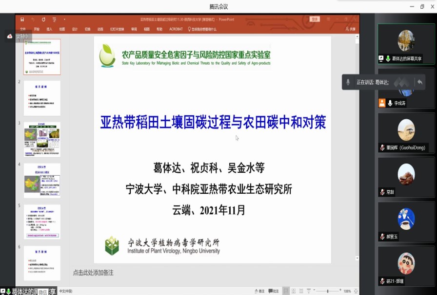 11月30日,受我??萍继幖碍h(huán)境科學與工程學院邀請,寧波大學葛體達教授作客我?!扒把乜茖W報告”,并以“亞熱帶稻田土壤固碳過程與農田碳中和對策”為題,圍繞目前“雙碳”熱點話題作了一場精彩的學術報告,環(huán)境學院師生及其他兄弟院校、科研院所師生共計230多人在線參加了會議。會議由環(huán)境學院副院長李成濤主持。