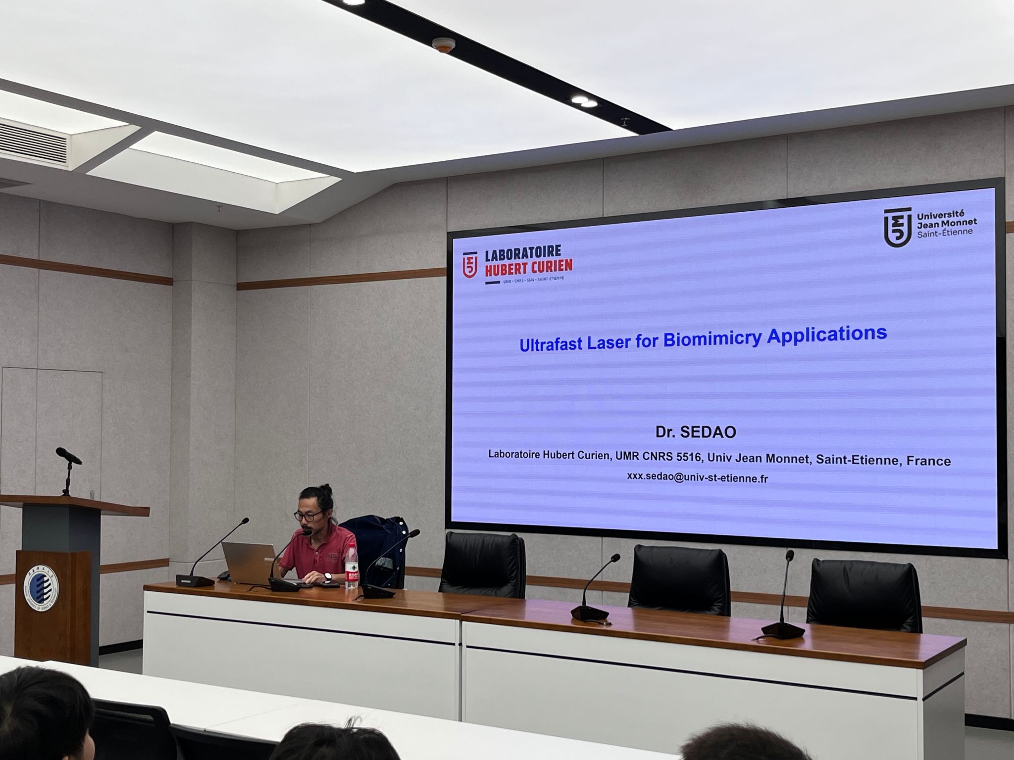 9月1日的報告中,SEDAO教授以“Ultrafast Laser Processing: Applications Overview”為題,系統(tǒng)講解了超高速激光脈沖與材料的相互作用機制、表面功能化技術(shù)及工業(yè)化應用路線,解析了核心技術(shù)原理與落地路徑,并結(jié)合增材制造、生物醫(yī)學等實例,展現(xiàn)了超快激光的廣泛應用潛力。3日,他以“Ultrafast Laser for Biomimicry Applications”為題,圍繞仿生學展開,闡述了仿生學理念,介紹了自然啟發(fā)表面的功能特性及超快激光紋理化技術(shù),還解析了眼科生物源材料中激光與材料的相互作用等內(nèi)容。5日的“Pulsed-Laser for Direct Coloration of Metals”報告,闡述了激光與物質(zhì)相互作用原理、金屬表面顏色呈現(xiàn)(含結(jié)構(gòu)色與色素色的區(qū)別)及相關(guān)加工工藝,通過光捕獲黑色表面等實例體現(xiàn)了應用價值。每場報告中,教授都與師生深入交流,解答技術(shù)難點,引導多學科交叉思考,幫助師生了解前沿動態(tài),對提升學校相關(guān)領(lǐng)域國際化交流層次意義重大。